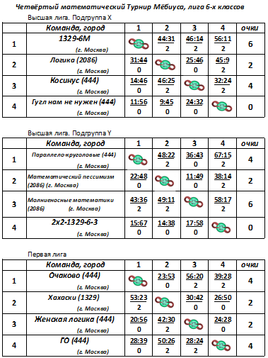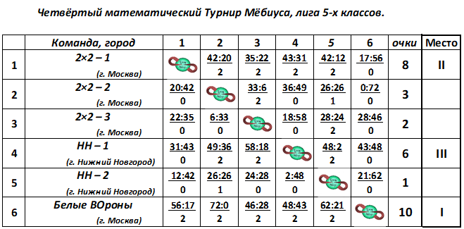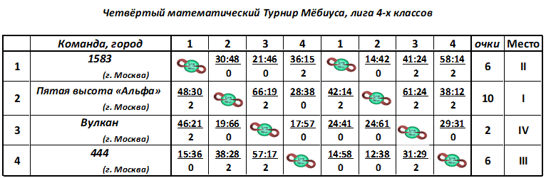 Четвёртый математический Турнир Мёбиуса прошёл с 17 по 21 ноября 2019 г. в Московской области при поддержке Творческой Лаборатории «Дважды Два» и журнала для любознательных «Квантик». В турнире приняли участие 22 команды школьников 4, 5 и 6 классов из Москвы (школы № 2086, 1329, 444, 1583, «Интеллектуал»; кружок «Пятая высота», сборная) и Нижнего Новгорода (Нижегородский филиал ТЛ «Дважды Два»)